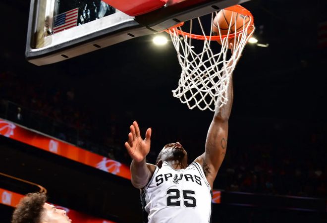 本场比赛中,被马刺下放到NBA发展联盟赛场进行锻炼的双向合同后场新星大卫-琼斯-加西亚(David Jones-Garcia)完成了自己在奥斯汀马刺的首秀,他在首秀中的表现也还是相当不错的。琼斯全场出场28分钟,投篮12中6,三分线外6中2,罚球11中10,拿下了全场最高分31分外加8篮板4助攻1抢断的数据,还有8次失误和2次犯规,正负值为+5。加西亚在进攻端还是展现出了相当不错的突破能力和得分能力,他也是能够给对手内线制造巨大的威胁,他也具备一定的投射能力。琼斯在防守端的表现也是值得肯定的,他也是能够起到一些防守方面的效果。琼斯在攻防两端其实都有着不错的表现,当然了,如果他能够控制自己的失误数,他的表现还能够更上一层台阶。