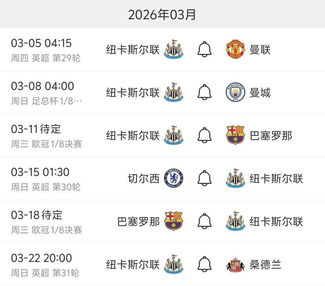 纽卡将在两周时间里连续迎战曼市双雄、切尔西,并进行与巴萨的两回合欧冠较量。3月最后一场比赛里,他们将在主场迎来东北德比对手桑德兰。